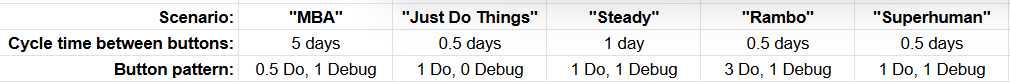 I’ve created this spreadsheet with five scenarios that play this game. I mess with two variables: