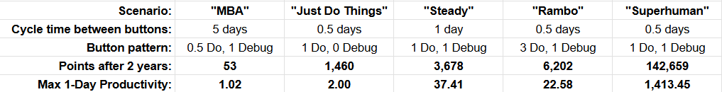 The “Superhuman” approach generates >20x more points over 2 years than the “Rambo” model, which operates at the same pace but has a different frequency of debugging - the pattern of doing/debugging matters.