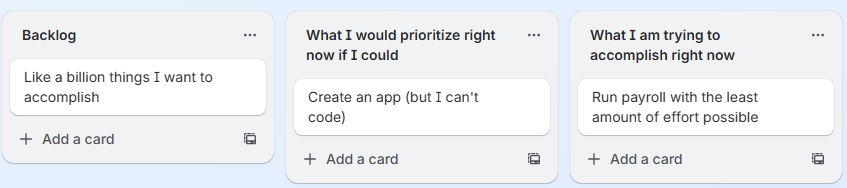 This is the framework I’m most known for: the customer’s to-do list! (Please, hold your applause.) Imagine a literal to-do list or project management software - I imagine a Trello board: